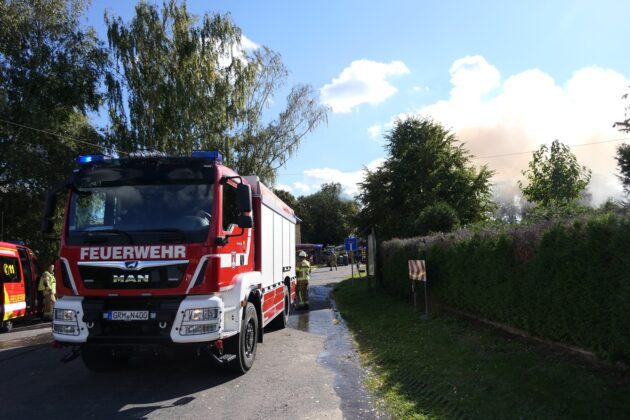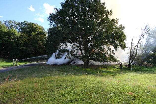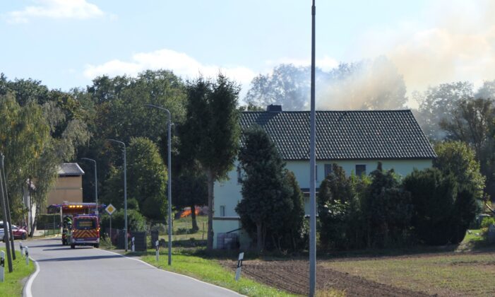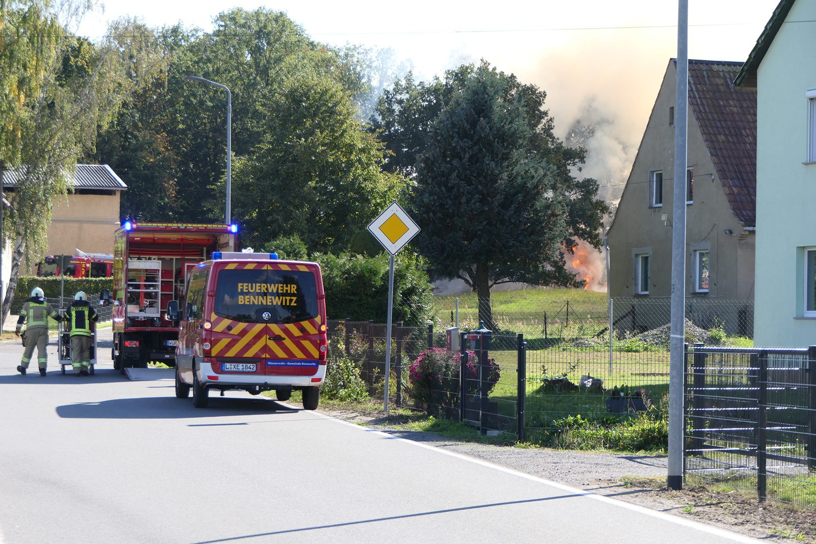 Gegen 14 Uhr war an einem Nebenweg der Polenzer Straße ein großer Strohhaufen in Flammen aufgegangen. Mehrere Ortsfeuerwehren der Gemeinde Bennewitz rückten aus, unterstützt von Tanklöschfahrzeugen aus Naunhof und Beucha sowie Kameraden aus Gerichshain, die mit einem Schlauchwagen zum Einsatz kamen.