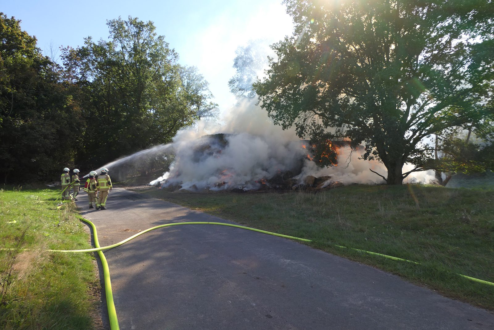 Nach bisherigen Erkenntnissen setzten Unbekannte die auf dem Feld gestapelten Strohballen in Brand. Die Feuerwehr entschied sich dazu, den Stapel kontrolliert abbrennen zu lassen. Die angrenzende Straße musste für circa 4,5 Stunden gesperrt werden. Der Sachschaden wird mit circa 28.000 Euro beziffert. Die Polizei ermittelt nun wegen des Verdachts eines Branddelikts.