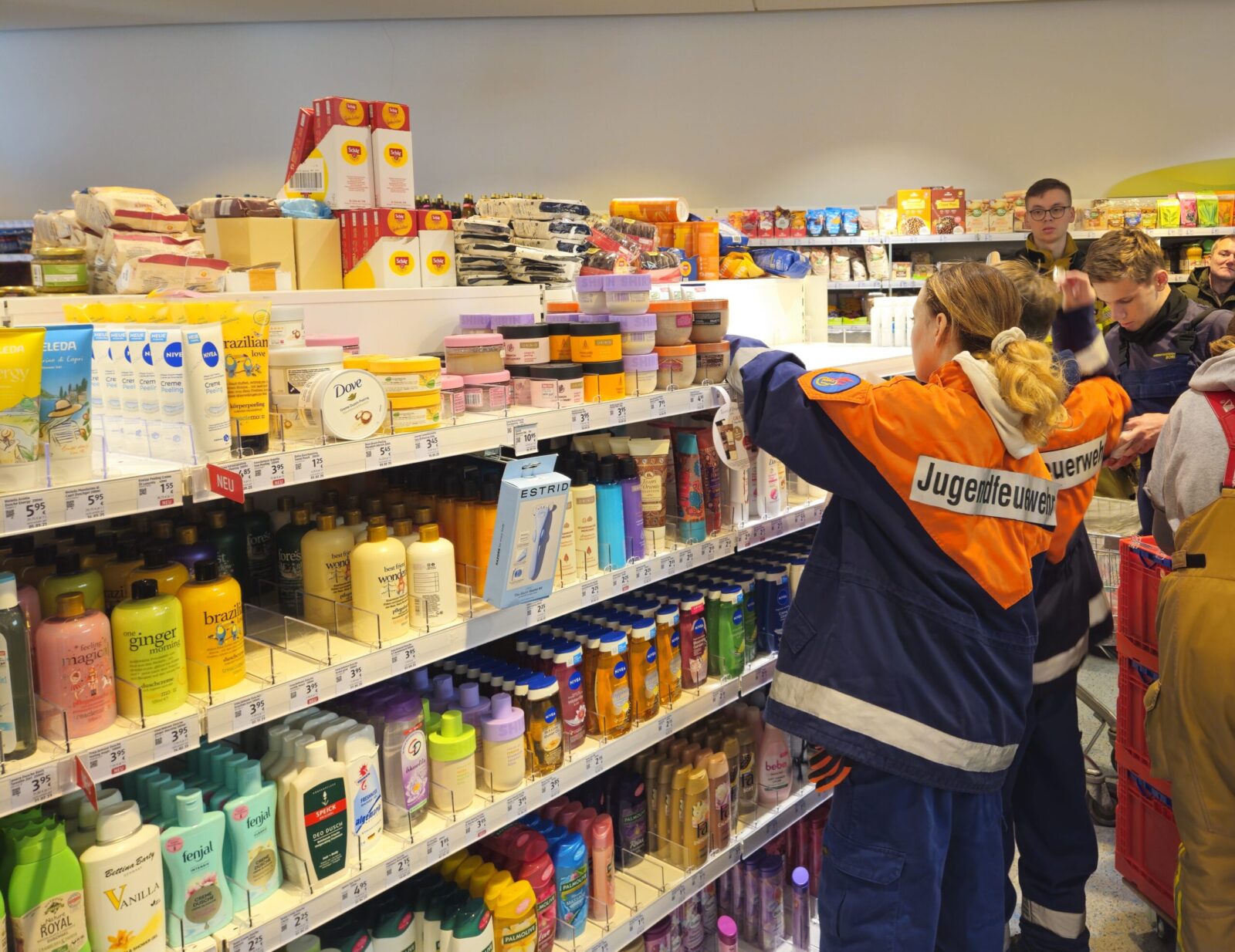Für die jungen Brandschützer bedeutete das: Bestellungen zusammensuchen, Regale nach Vorgabe einräumen und liegengebliebene Artikel zurücksortieren – alles unter Zeitdruck und im Team. Die Aufgaben sollten den oft hektischen Alltag im Einzelhandel widerspiegeln und mussten innerhalb von drei Minuten erledigt werden.
