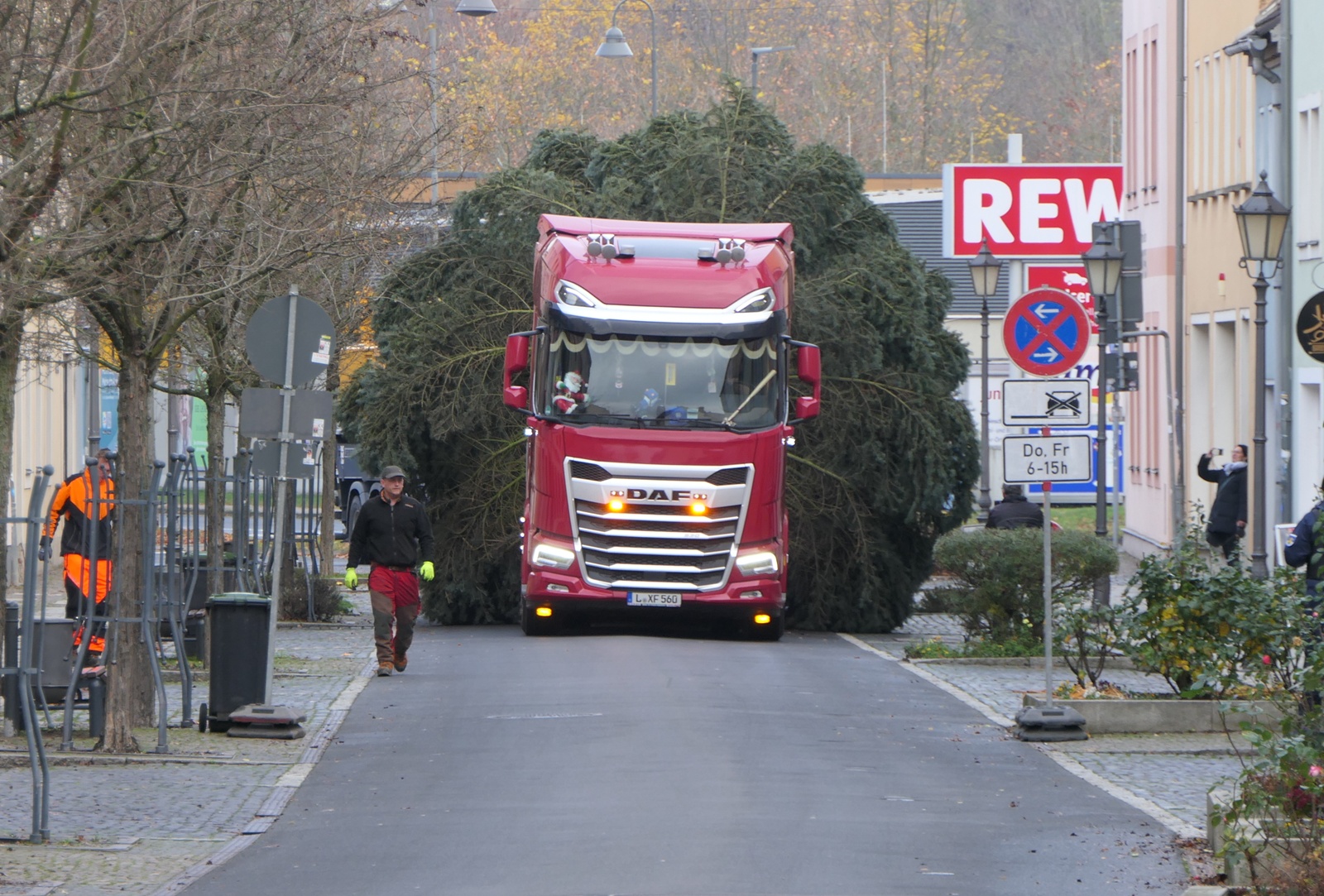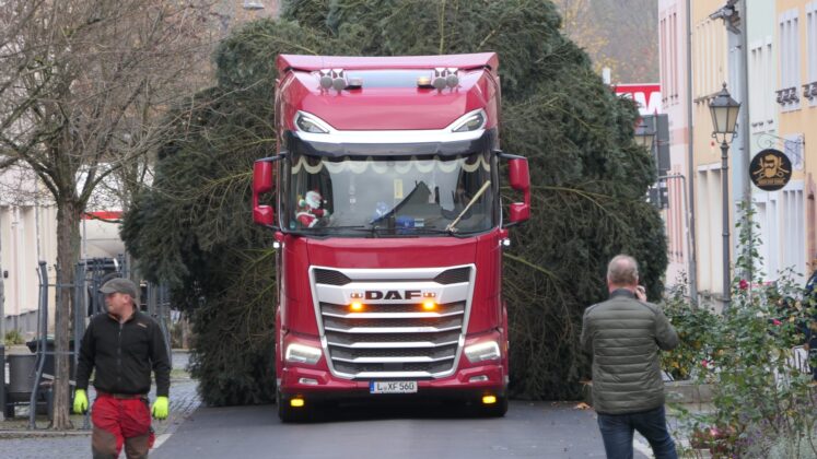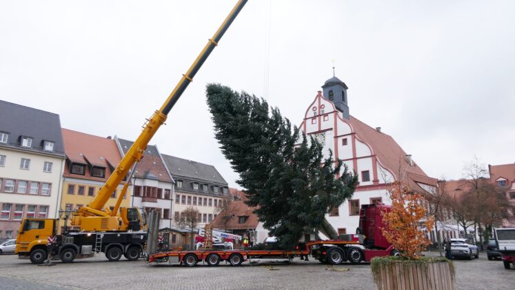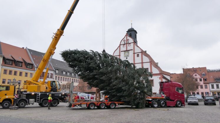 Gegen 10 Uhr traf die rund 15 Meter hohe Tanne aus Otterwisch auf dem Platz vor dem Rathaus ein und wurde wenig später an ihrem traditionellen Standort verankert. Der imposante Baum bildet den festlichen Mittelpunkt des Grimmaer Weihnachtsmarktes, der am 28. November eröffnet und anschließend 17 Tage lang Besucherinnen und Besucher in der Altstadt begrüßt.