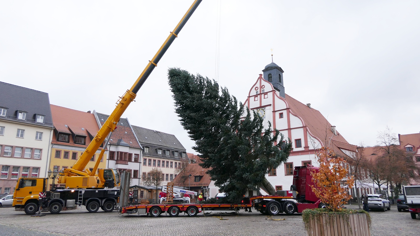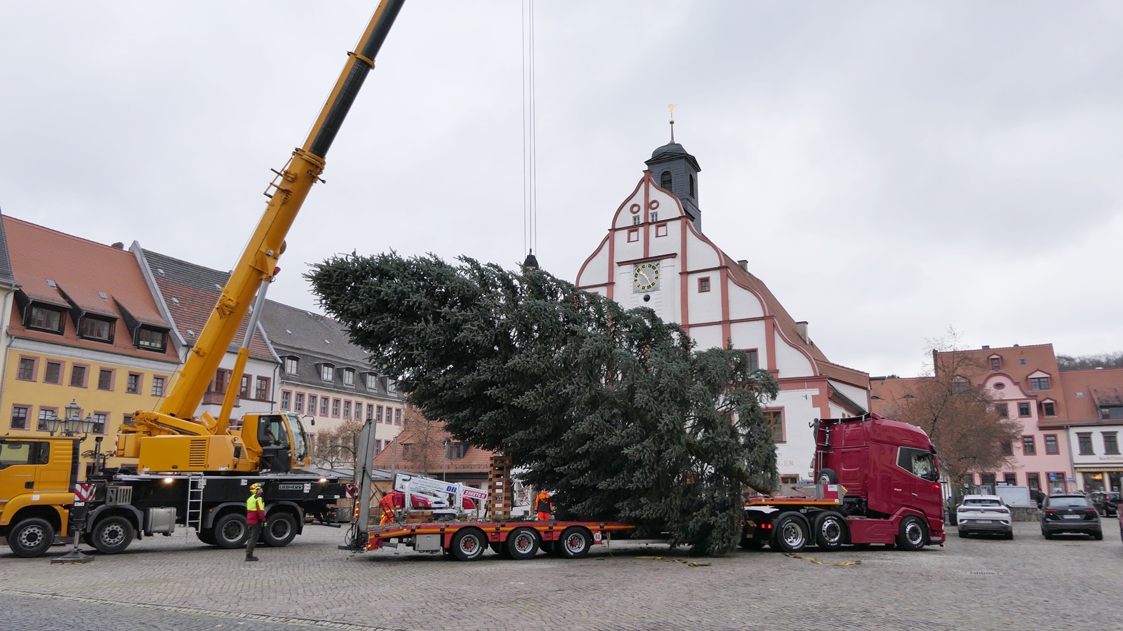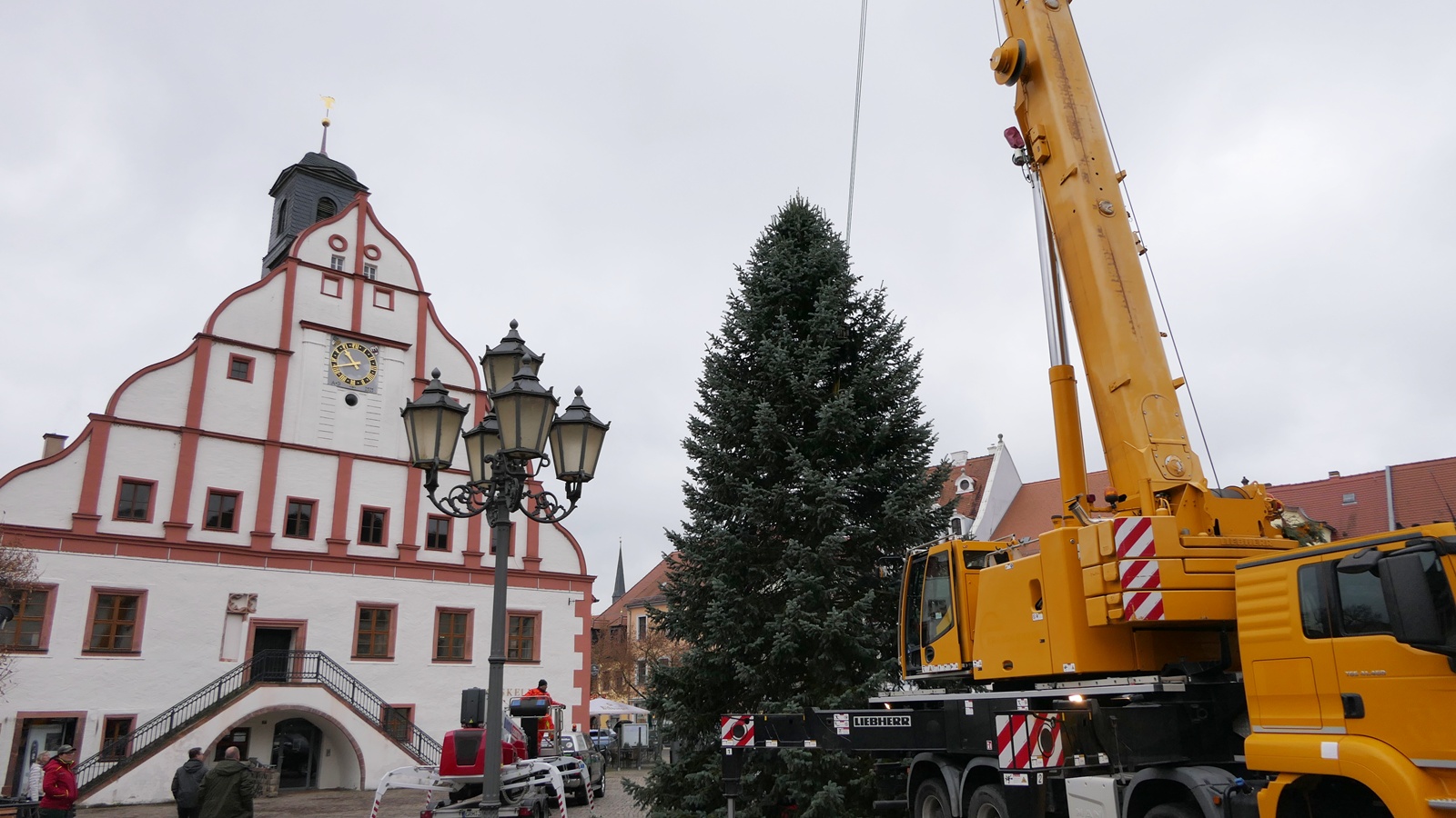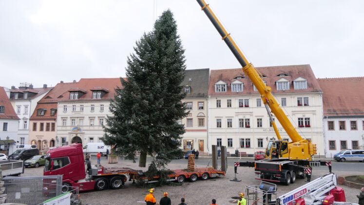 Grimma. Der Startschuss für die Adventssaison ist gefallen: Am Montagvormittag wurde auf dem Grimmaer Markt der diesjährige Weihnachtsbaum aufgerichtet.
