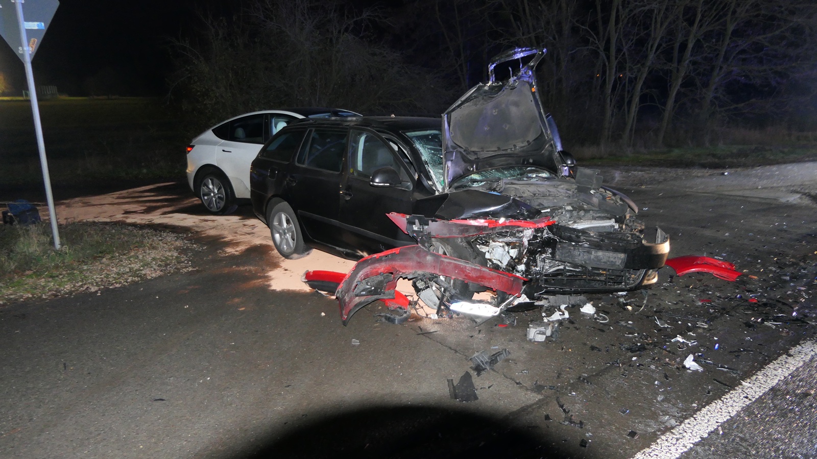 Gegen 17 Uhr kollidierten an einer Kreuzung in Höhe des örtlichen Sportplatzes drei Fahrzeuge: ein Opel, ein Skoda und ein Tesla.