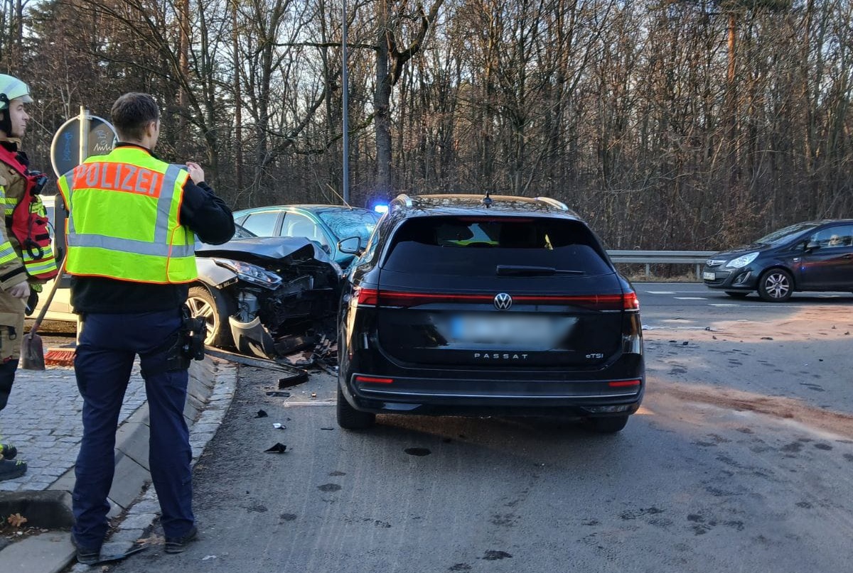 Nach ersten Informationen kam es gegen 14 Uhr am Abzweig zur Straße des 9. Novembers zu einer Kollision zwischen einem Ford, einem Kia und einem VW.