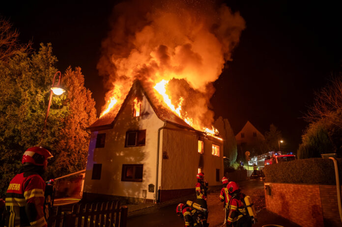 Gegen 1.30 Uhr schlugen die Flammen aus dem Dachstuhl des Gebäudes in der Polkenberger Dorfstraße. Anwohner alarmierten umgehend den Notruf 112. Als die ersten Kräfte eintrafen, bestätigte sich die Lage – das Haus stand bereits großflächig in Brand.