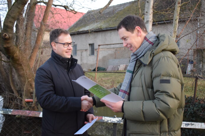 Grimmas Oberbürgermeister Tino Kießig und LDS-Präsident Béla Bélafi (v.l.n.r.) bei der Übergabe des Fördermittelbescheids(© Stadt Grimma)