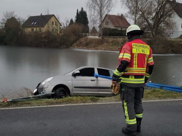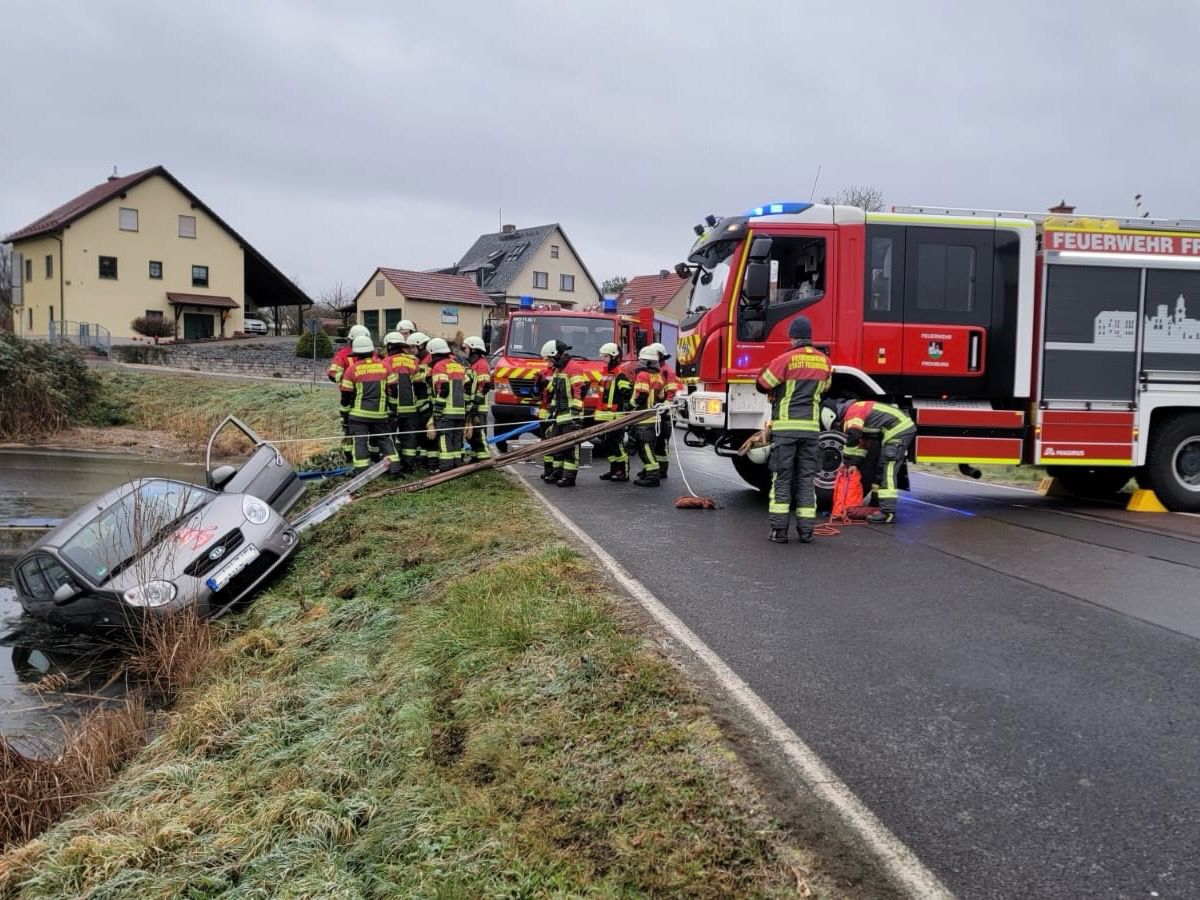 Ein Pkw war dort offenbar einen Hang hinabgerutscht und teilweise in einen Teich gestürzt – zwei Personen befanden sich noch im Fahrzeug und konnten sich nicht selbst befreien.