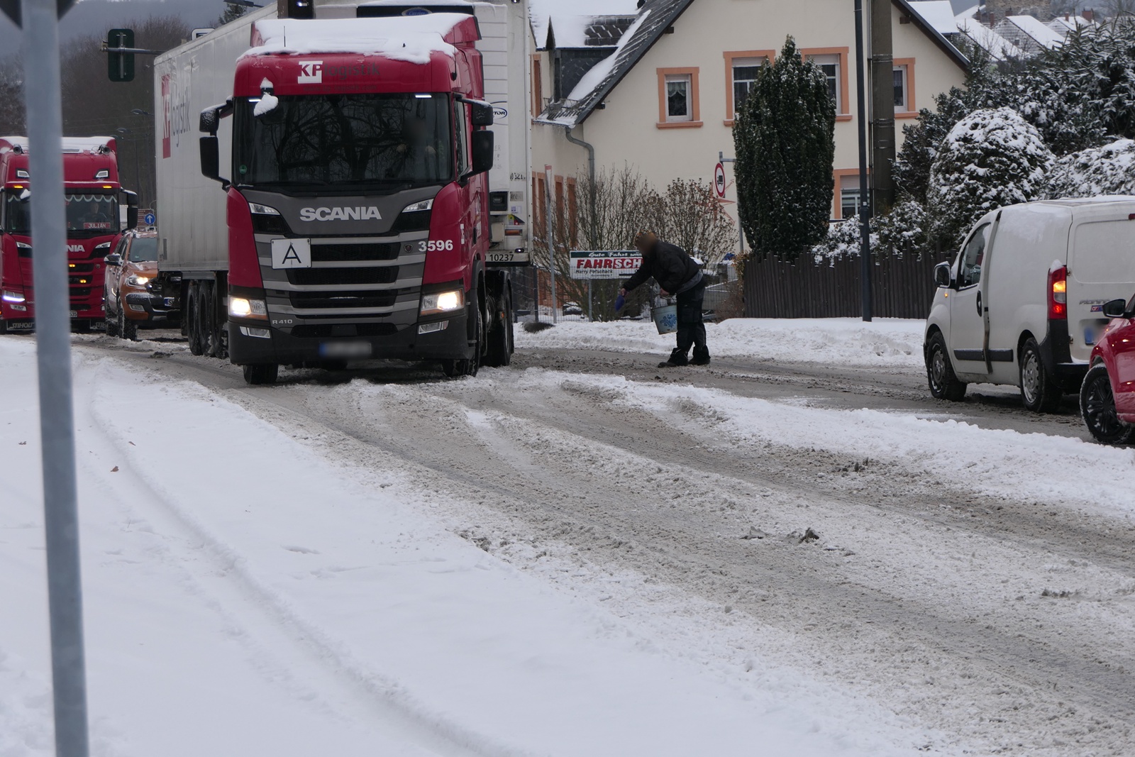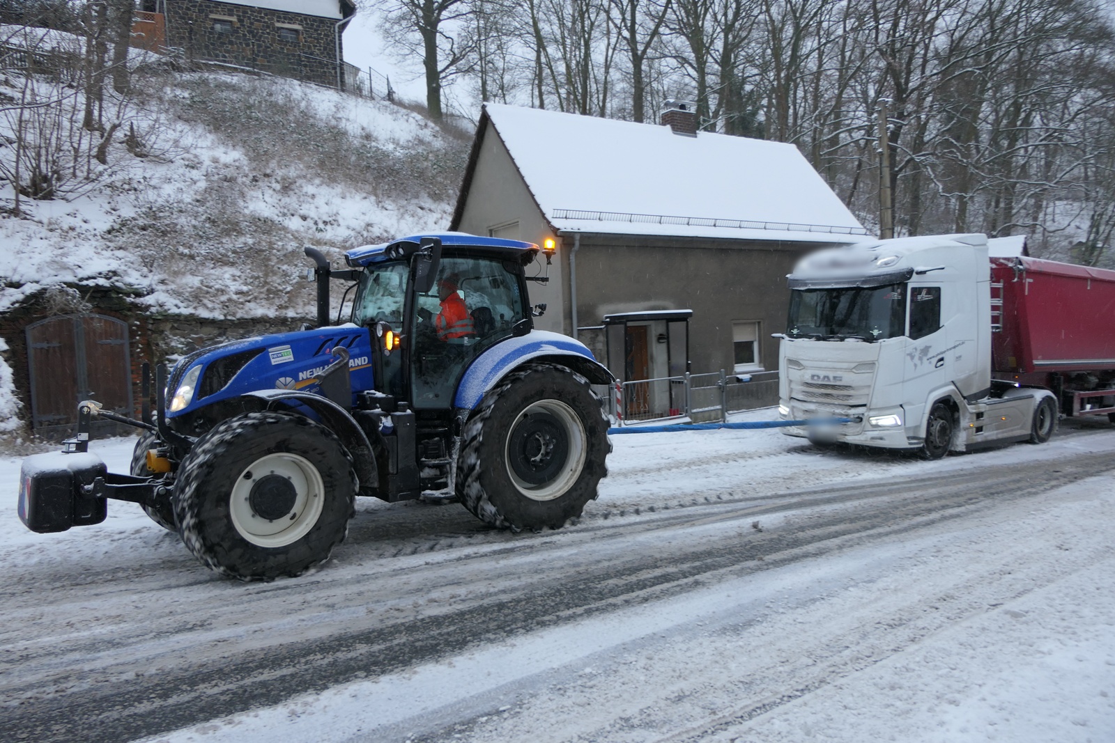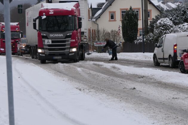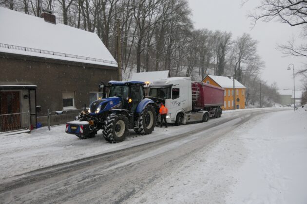 Ungewöhnliche Hilfe kam dabei von Grimmas Oberbürgermeister Tino Kießig. Auf der B107/Wurzener Straße griff er selbst ein und unterstützte feststeckende Brummifahrer mit einem Traktor, um die Fahrzeuge den steilen Berg hinaufzuziehen.