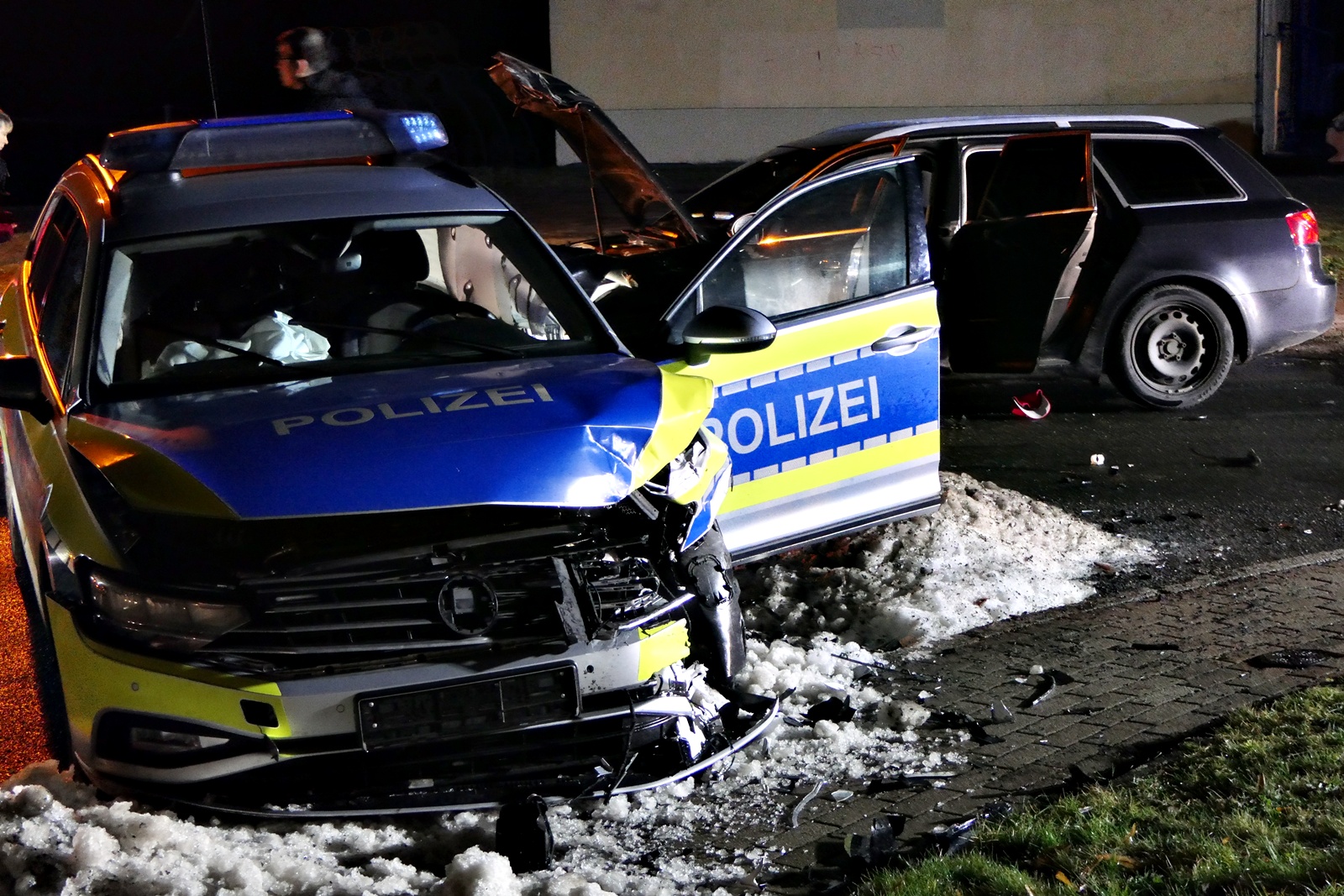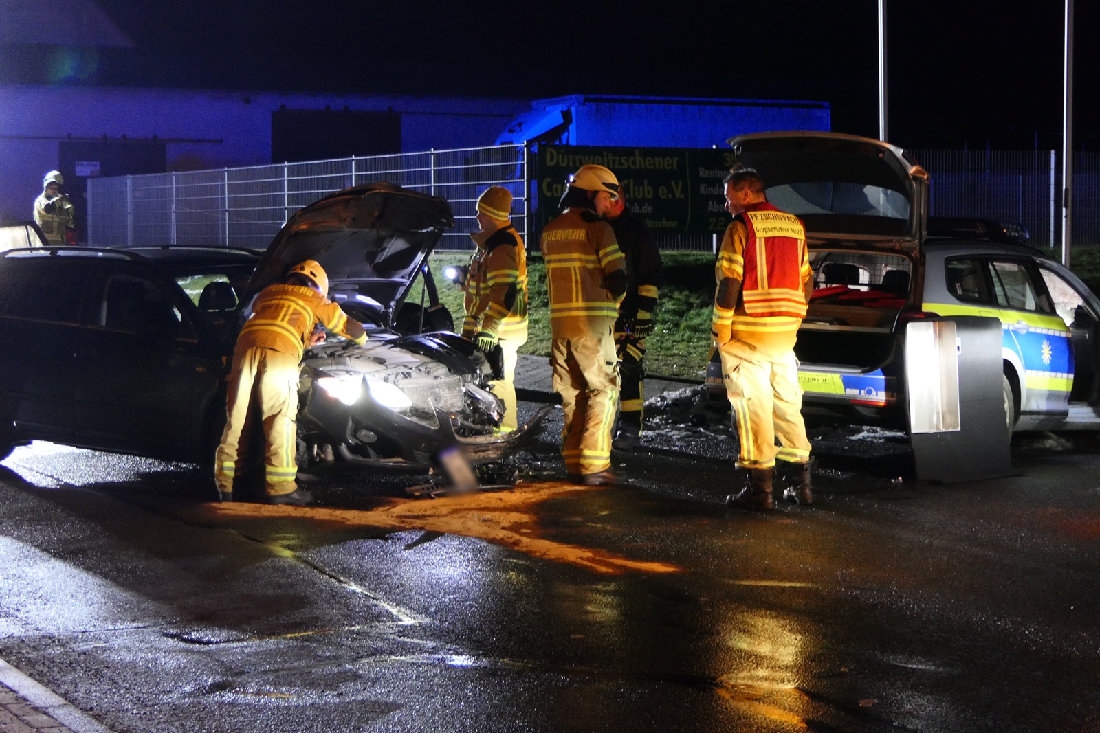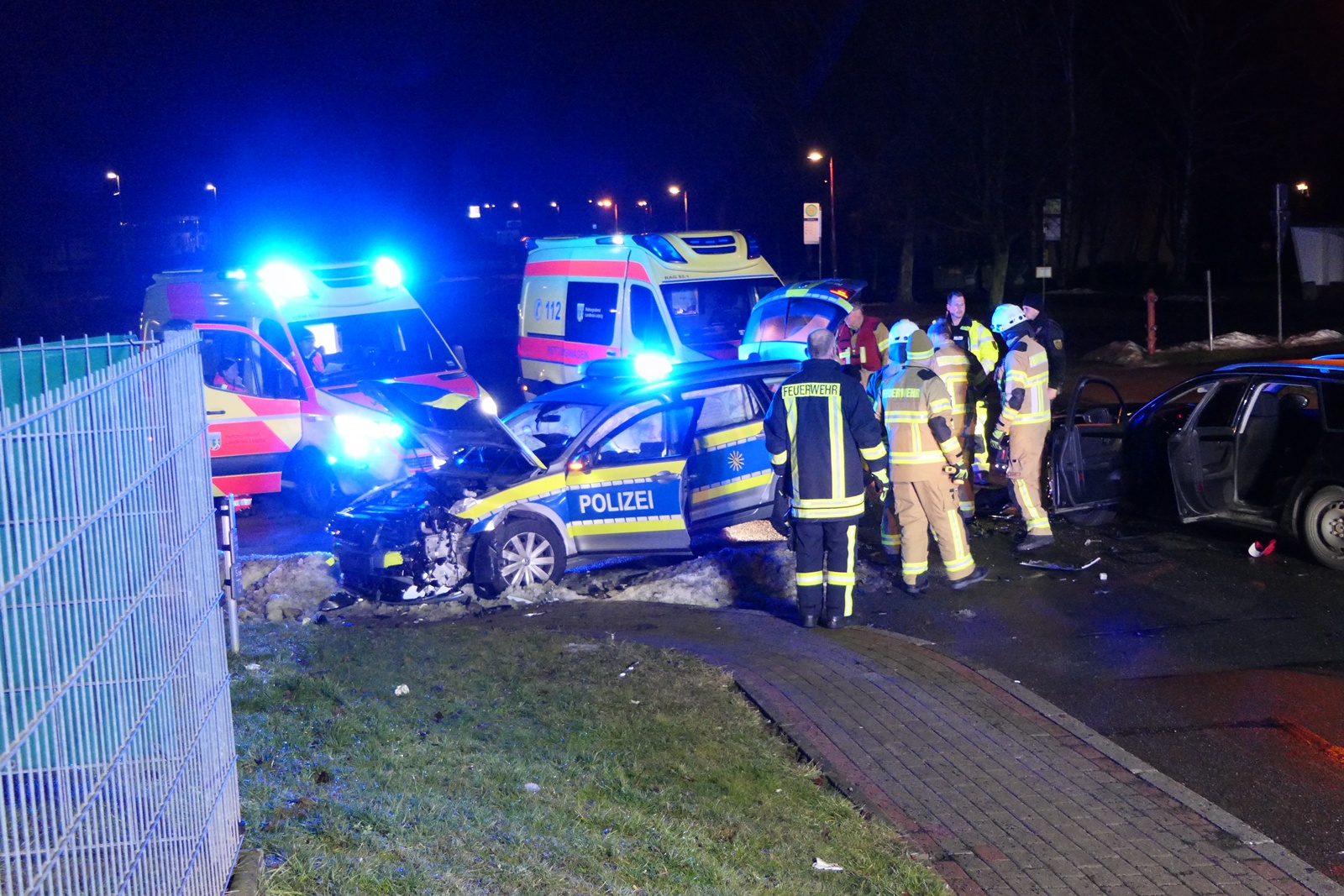 Gegen 00:45 Uhr kam es auf der Obstlandstraße im Grimmaer Ortsteil Dürrweitzschen zu einem Frontalzusammenstoß zwischen einem Streifenwagen der Polizei und einem Pkw der Marke Seat. Drei Personen wurden dabei verletzt und mussten in Krankenhäuser eingeliefert werden.