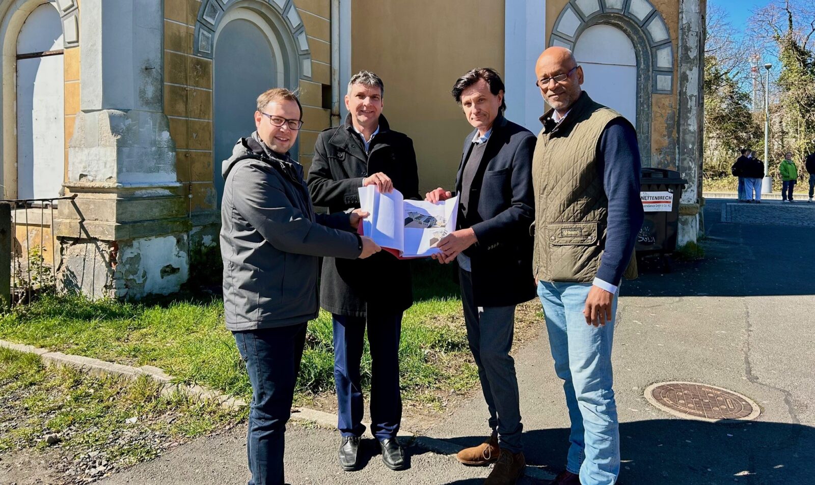 Foto: (v.l.n.r.) Grimmas Oberbürgermeister Tino Kießig, Landrat des Landkreises Leipzig Henry Graichen, Architekt Marco Stelzel, Bauherr Samuri Reum