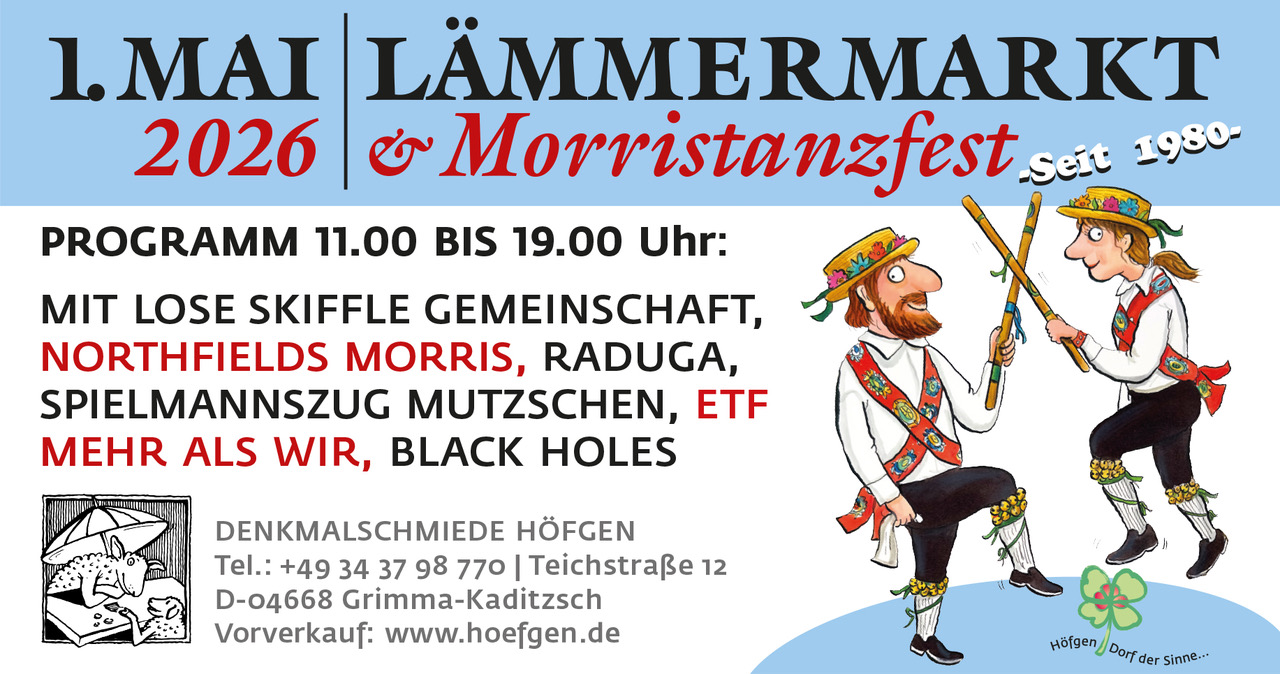 Kaditzsch lädt am 1. Mai 2026 erneut zu einem besonderen Frühjahrsereignis ein: Der traditionelle Lämmermarkt wird auch in diesem Jahr mit dem farbenfrohen Morristanzfest kombiniert. Von 11 bis 19 Uhr verwandelt sich das Gelände der Denkmalschmiede Höfgen in einen lebendigen Treffpunkt für Kultur, Handwerk und internationale Folklore.